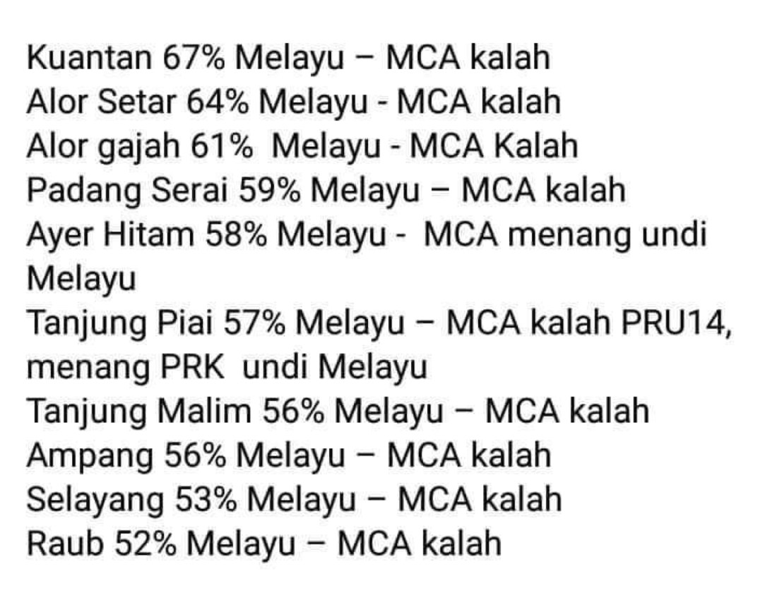 MCA juga telah menyebabkan BN kalah di semua kawasan majoriti Melayu di PRU14 (kecuali Air Hitam).