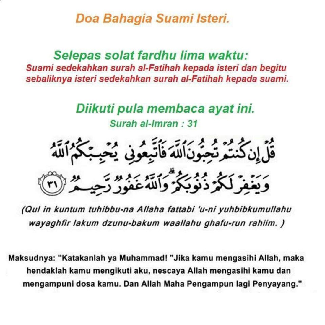 Semoga setiap suami isteri saling mendoakan dan setiap Anak dan ibu ayah tetap mendoakan. Doa ini boleh dibaca untuk satu keluarga agar cenderung mencintai Allah dan menekuni ajaran Nabi Muhammad saw.
