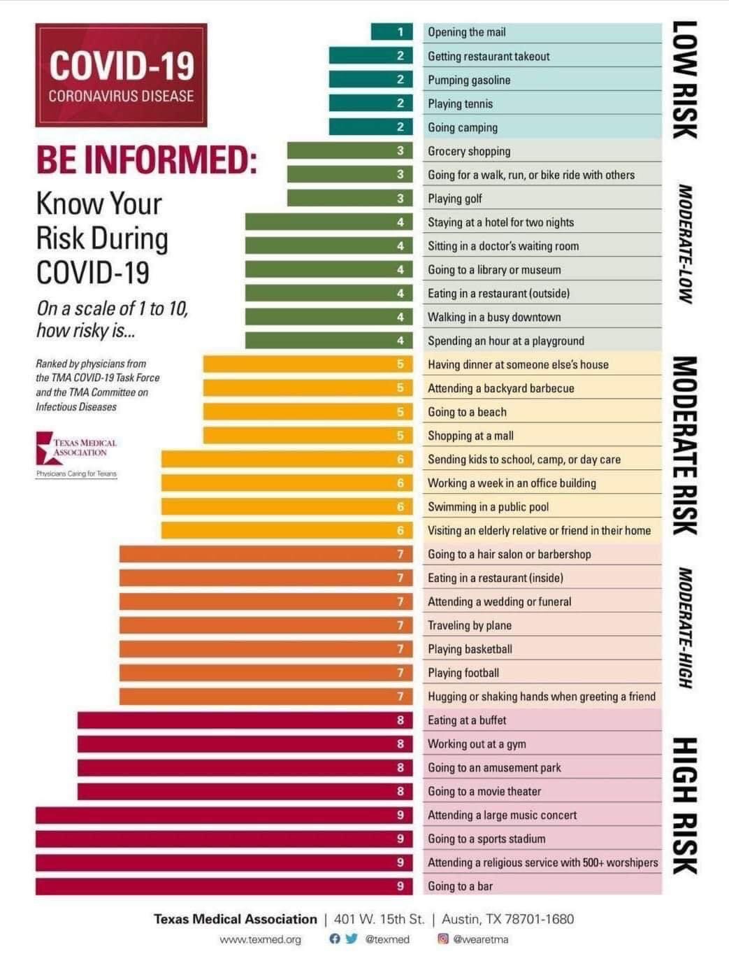 Covid-19 risk index; know your risk before you engage in any activity. Managing the risk levels of exposure is part of self enpowerment and self regulation.