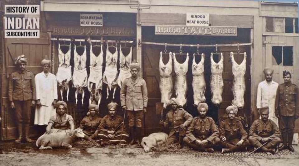 Left side says, ‘ Mohammedan Meat House ‘ means Halal and the right side says, ‘ Hindoo Meat House ‘ means most of them are not halal for Sikh soldiers.