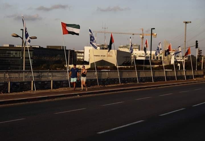 Bendera-bendera Israel dan UAE dikibarkan di sepanjang jalan-jalan (tanah jajahan Israel) bagi meraikan normalisasi antara Israel dan UAE 🤮