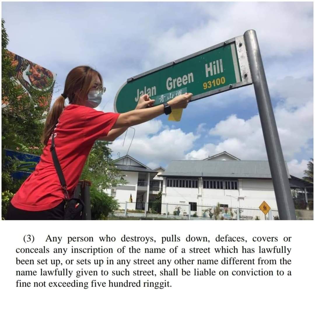 Sebaliknya mereka telah melanggar Perkara 103(3), Ordinan Kerajaan Tempatan 1996: Any person who destroys, pulls down, covers, conceals or defaces any such name or number or, without the written permission of the local authority, puts up any name or number different from the name or number put up, assigned or allocated by the local authority, shall be guilty of an offence: Penalty, a fine not exceeding one thousand ringgit.”
