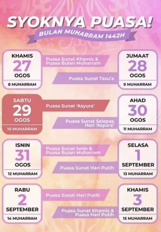 Sehubungan itu. Kita berada di bulan Muharram 1442 mulai Khamis ini 27 Ogos kita d galakkn berpuasa: