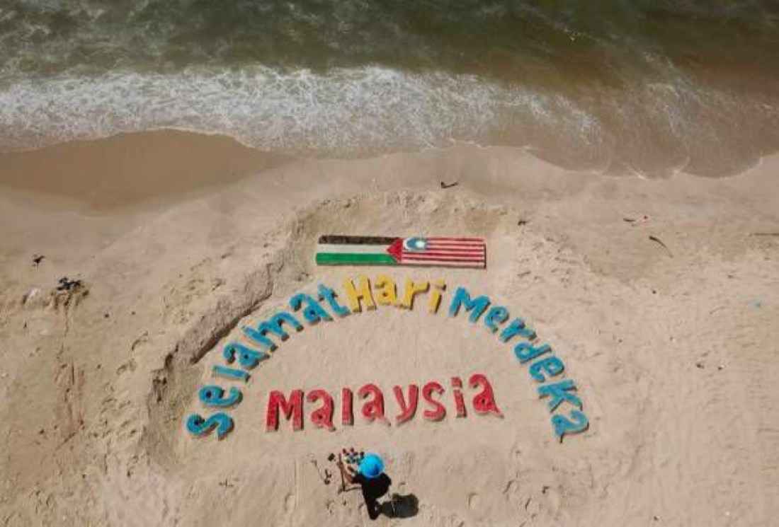 Sempena Hari Kebangsaan ke-63, satu hamparan pasir di sebuah pantai di Gaza, Palestin, dikorek oleh beberapa individu warga tempatan untuk membentuk rangkaian perkataan yang memaparkan kata-kata ‘Selamat Hari Merdeka Malaysia’.