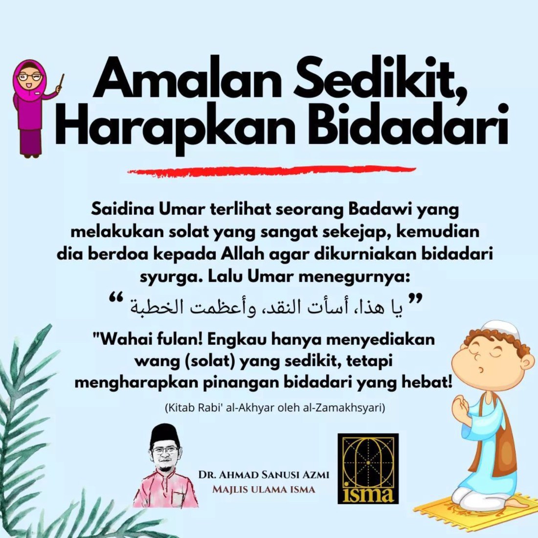 “Wahai fulan, engkau hanya menyediakan wang yang sedikit (kiasan bagi solat yang sedikit), tetapi engkau berharap pinangan yang besar (iaitu bidadari syurga)!” (Kitab Rabi’ al-Akhyar oleh Abu al-Qasim al-Zamakhsyari).