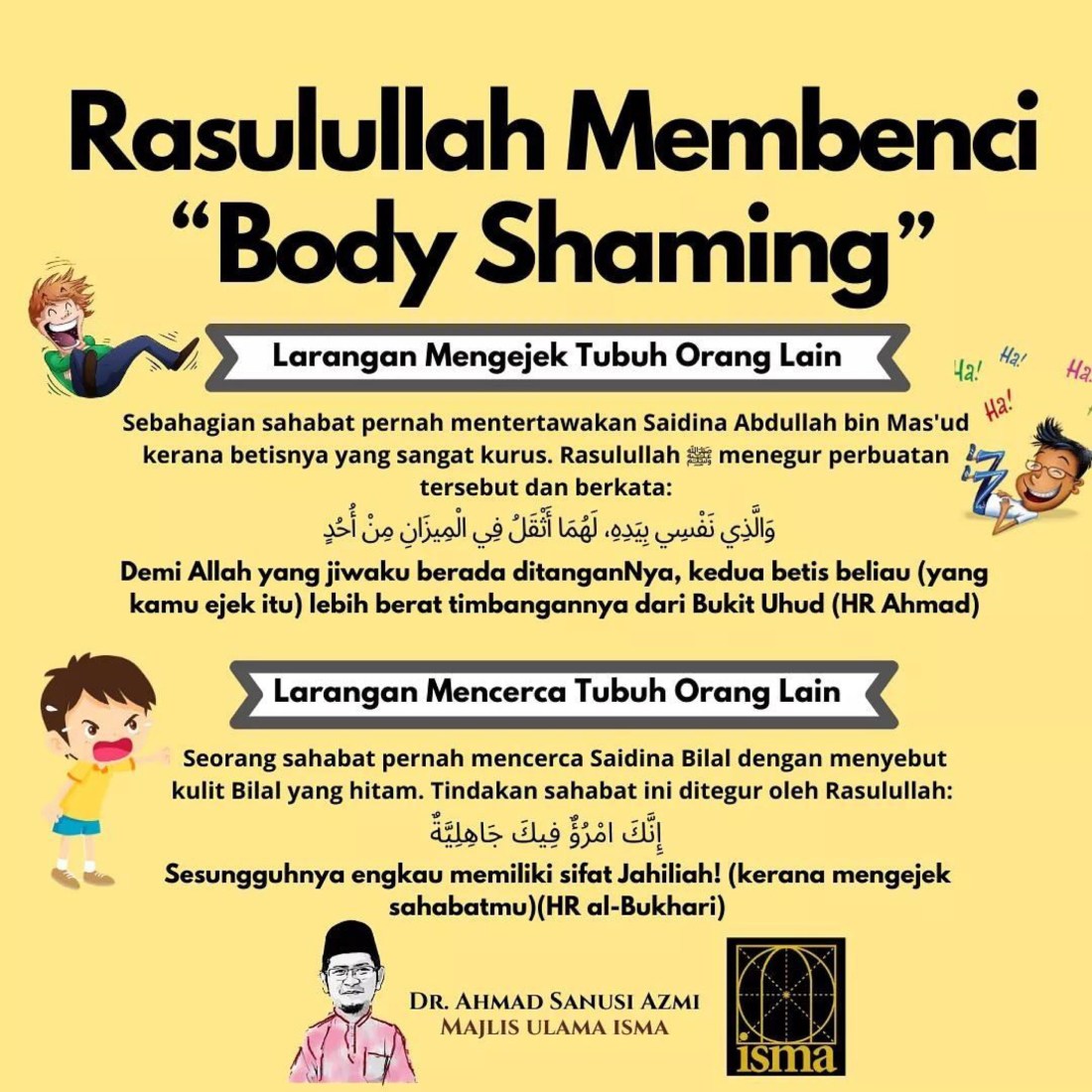 1. Telah tersebar video seorang wanita mencerca dan mengeluarkan kata-kata kesat sehingga menghina tubuh wanita yang lain (body shaming). Sebarang perbuatan menyakiti manusia lain adalah ditegah dalam Islam.