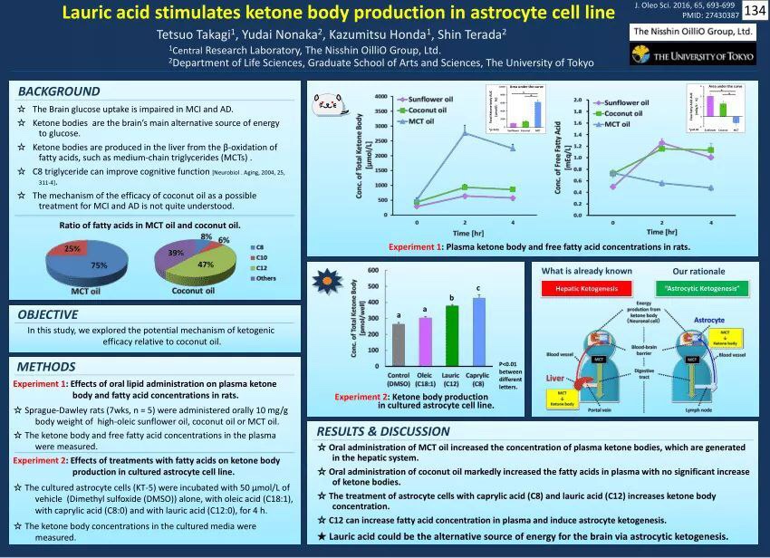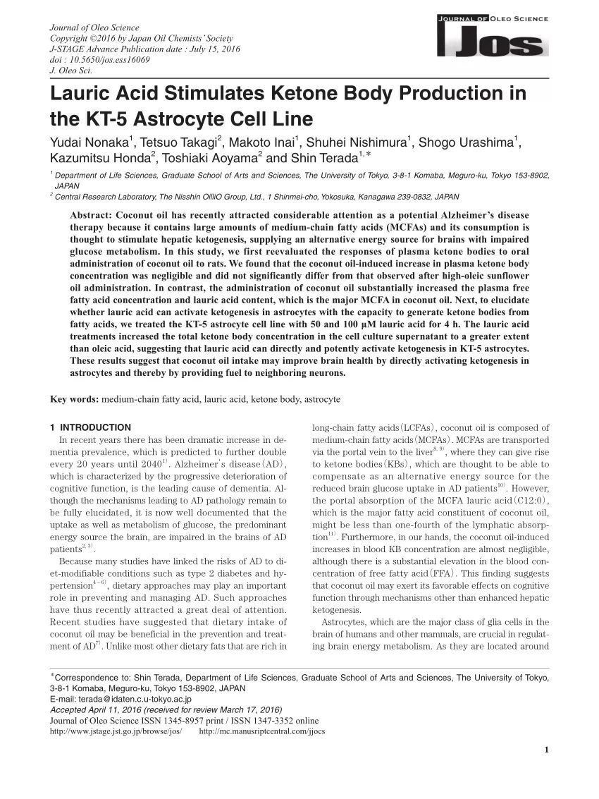 Kajian menunjukkan asid lemak MCT iaitu asid kaproik (C6), asid kaprilik (C8), asid kaprik (C10) dan asid laurik (C12)/monolaurin sangat mudah ditukarkan menjadi ketone oleh hati. Kajian menunjukkan MCT ini sangat cepat diserap oleh usus tanpa memerlukan bantuan hempedu daripada hati. Selepas diserap di usus, MCT ini akan terus dihantar ke hati dan ditukarkan menjadi jasad ketone. Jasad ketone ini pula akan digunakan untuk menjadi tenaga di dalam sel-sel tubuh kita dengan menukarkan nya menjadi Acetyl-CoA dalam sel-sel tubuh. Acetyl CoA juga di hasilkan daripada glukosa. Oleh kerana itu apabila cukup Acetyl CoA daripada ketone di hasilkan , maka sel-sel tidak lagi memerlukan glukosa sebagai sumber tenaga. Acetyl CoA ini akan masuk ke kitaran TCA untuk menghasilkan tenaga dalam bentuk ATP.