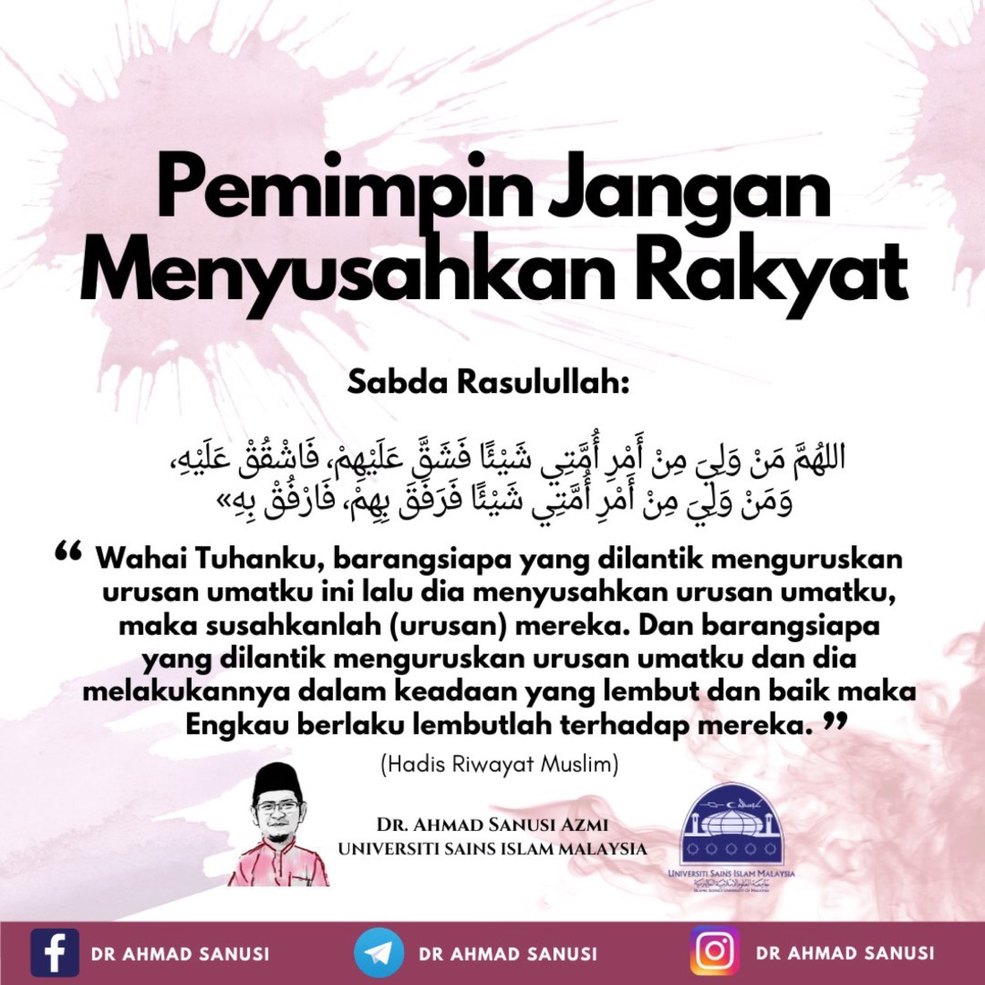 2. Dalam sebuah hadis yang diriwayatkan oleh al-Imam Muslim, Rasulullah pernah mendoakan buat setiap pemimpin yang memudahkan urusan umat ini agar diberikan kemudahan oleh Allah. Manakala pemimpin yang menyusahkan urusan umat ini, maka Rasulullah mendoakan kesusahan buat mereka.