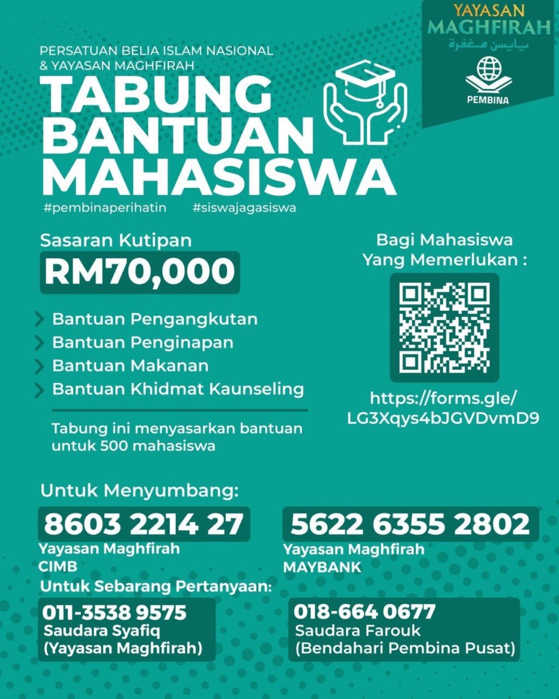 3. Atas dasar itu Persatuan Belia Islam Nasional (Pembina) dengan kerjasama Yayasan Maghfirah mengambil tanggungjawab untuk meringankan beban mahasiswa yang terjejas dengan mewujudkan tabung khas kecemasan untuk mahasiswa tersebut.