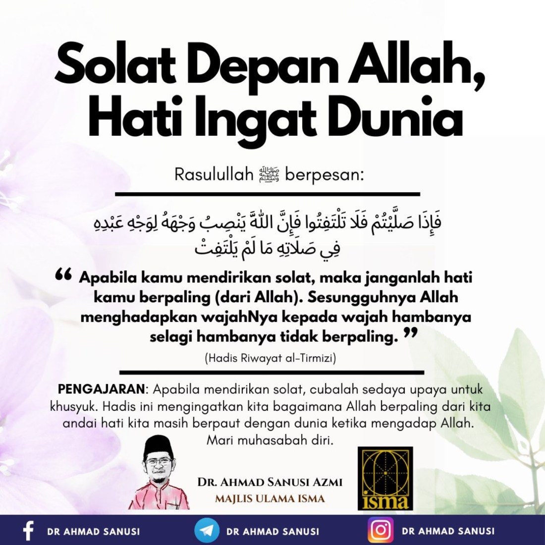 “Apabila kamu mendirikan solat, maka janganlah hati kamu berpaling (dari Allah). Sesungguhnya Allah menghadapkan wajahNya kepada wajah hambanya selagi hambanya tidak berpaling.” (HR al-Tirmizi, dinilai Sahih)