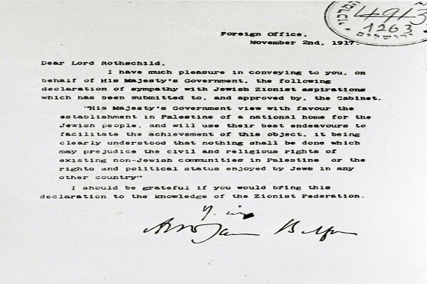 Dokumen yang paling terkenal adalah surat pendek yang ditulis oleh Menteri Luar Negeri Britain, Lord Arthur Balfour kepada Lord Lionel Walter Rothschild, presiden Persekutuan Zionis, pada 2 November 1917. Perdana Menteri Lloyd George kemudian menjelaskan perjanjian itu dengan syarat:
