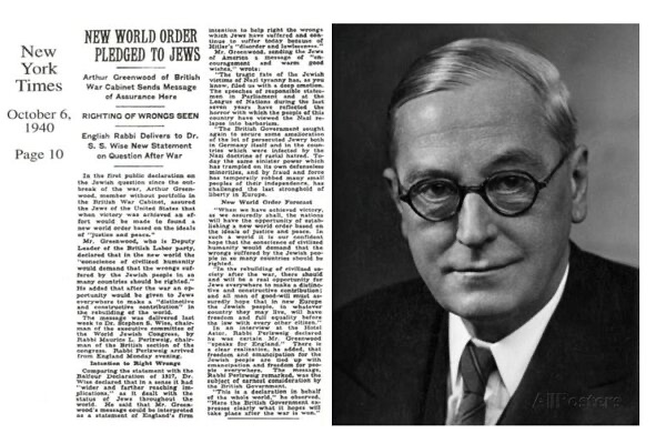 As soon as he had become Prime Minister in May 1940, Churchill instructed his War Cabinet member Arthur Greenwood to craft a document assuring the Jewish elites that a winning Britain will give them not only Palestine but a major share in the “new world order” to compensate for “the wrongs suffered by the Jewish people.” Although it is little known, this “Greenwood Pledge” is, according to Zionist Rabbi Stephen Wise, “of wider and farther reaching implications” than the Balfour declaration. The New York Times published it in its October 6, 1940 edition, under the amazing title “New World Order Pledged to Jews” (reproduced here and here).