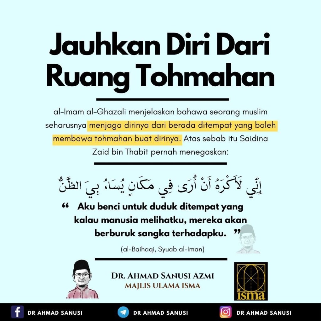 1. Di dalam kitab Ihya Ulumuddin, al-Imam al-Ghazali menjelaskan bahawa seorang muslim seharusnya menjaga dirinya dari berada di ruang yang boleh membawa tohmahan buat dirinya. Atas sebab itu Saidina Zaid bin Thabit pernah menegaskan: