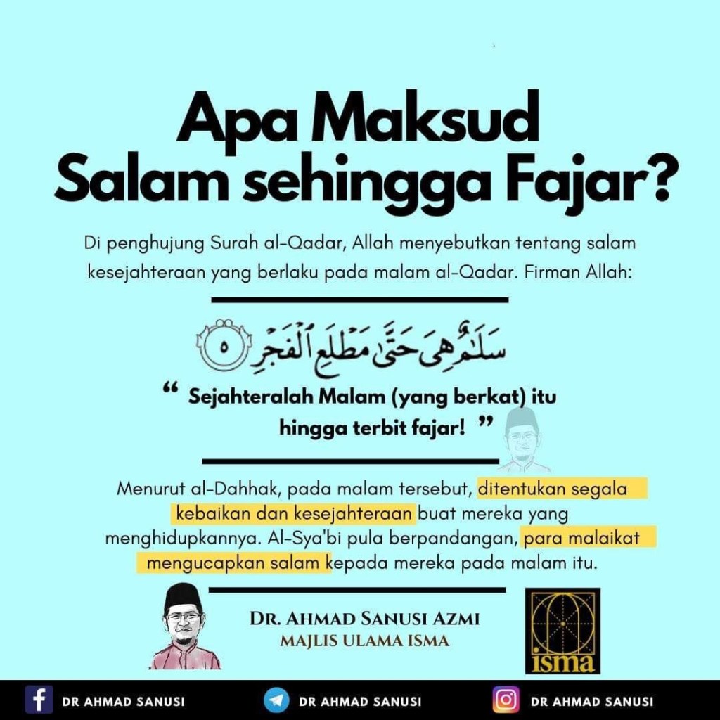 “Salam tersebut adalah ucapan malaikat pada malam al-Qadar ke atas ahli masjid, bermula dari lenyapnya matahari (masuk maghrib), sehinggalah terbitnya fajar.” (Tafsir al-Baghawi)