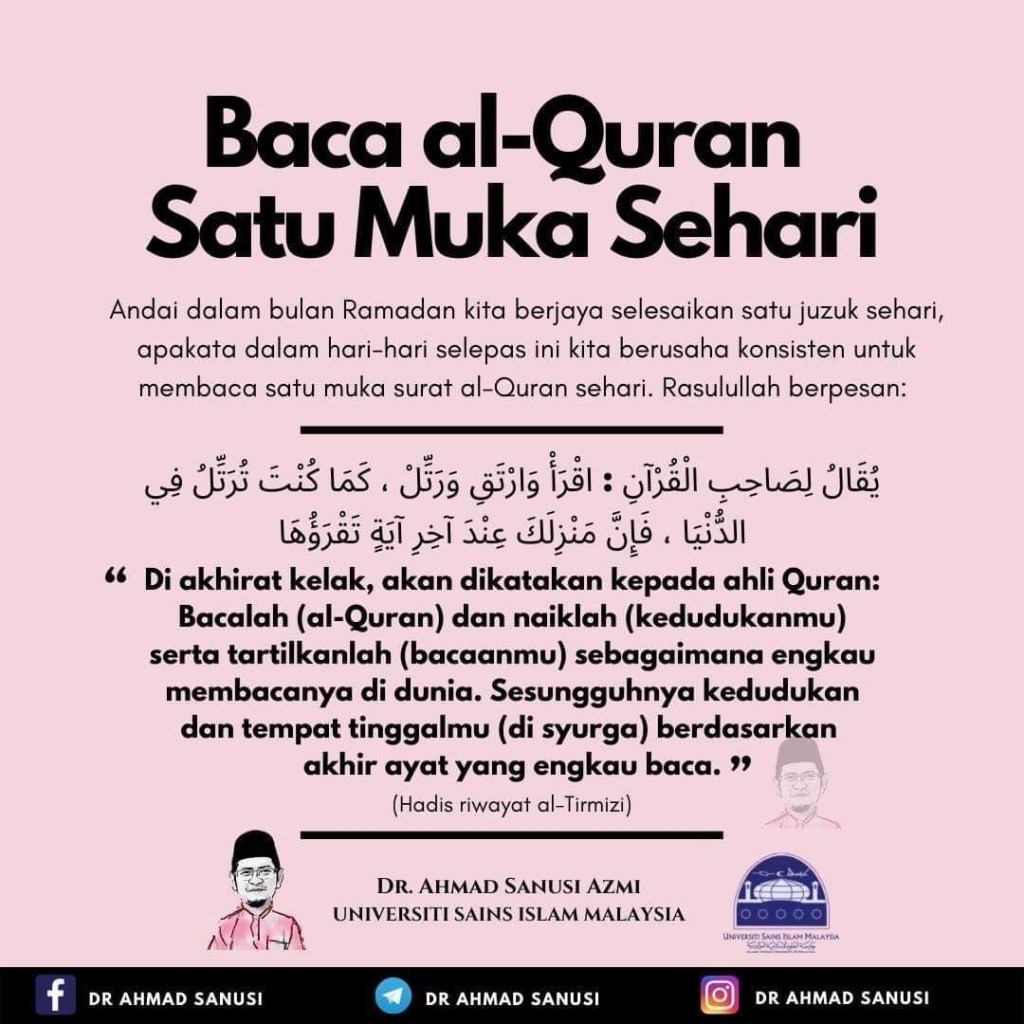 3. Bagi bacaan al-Quran, Rasulullah ๏ทบ mengingatkan kita bahawa kedudukan seseorang di akhirat kelak adalah bergantung kepada akhir ayat yang dibaca. Lagi banyak di baca, lagi tinggi kedudukan kita. Justeru, bacaan al-Quran mesti diteruskan setelah Ramadan. Sabda Rasulullah๏ทบ: