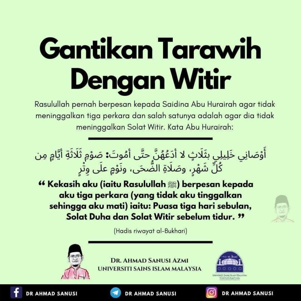 5. Manakala bagi amalan solat tarawih pula, kita boleh terus konsisten melakukannya dengan solat sunat witir setelah isyak. Saidina Abu Hurairah menceritakan bahawa Rasulullah๏ทบ berpesan kepada beliau tentang tiga amalan yang tidak pernah beliau tinggalkan sepanjang beliau hidup iaitu โ(1) Solat witir, (2) Puasa tiga hari setiap bulan dan (3) Solat Duha (HR al-Bukhari). Kata Abu Hurairah: