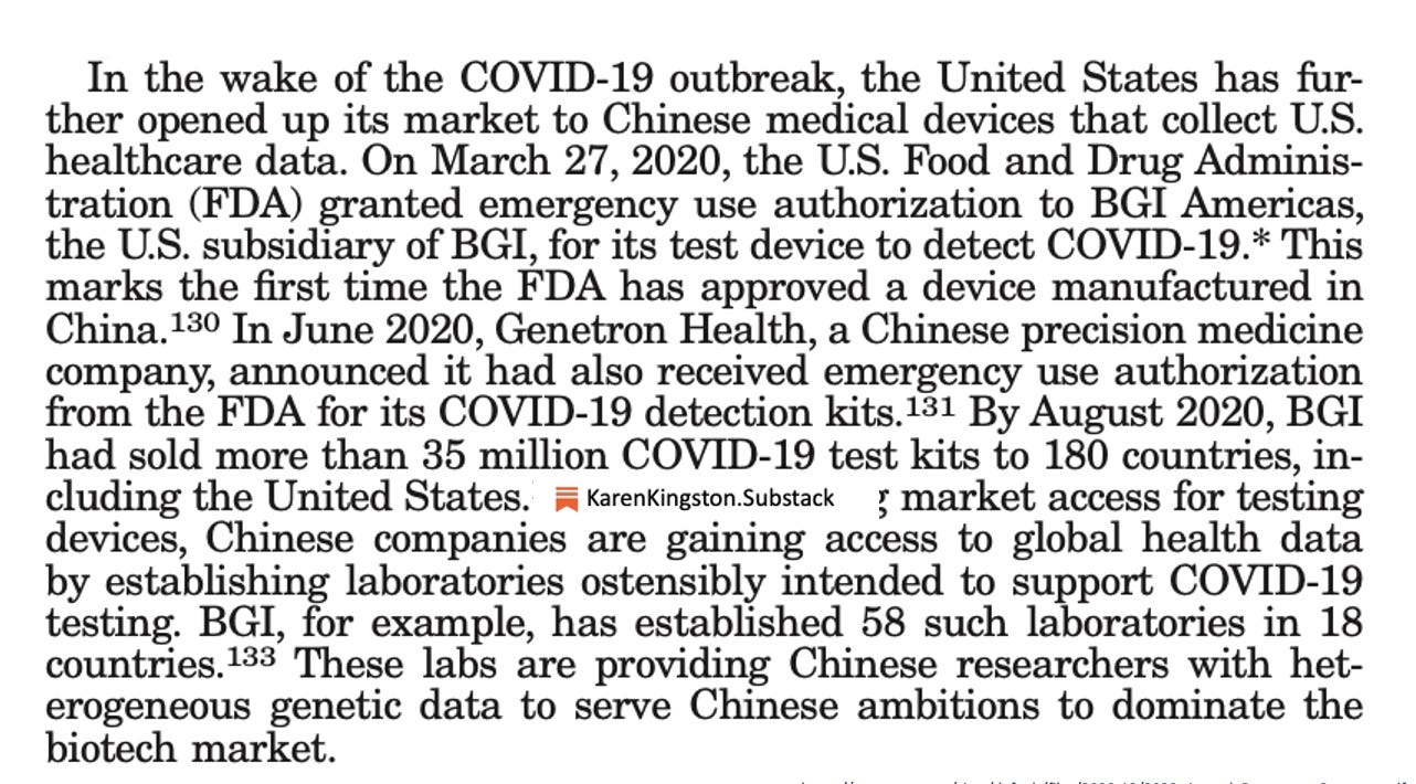 A 2020 Congressional report confirms that China aggressively marketed their COVID-19 kits around the world, selling their genetic collection PCR kits in 180 countries and establishing Chinese genomic labs in 18 countries by August of 2020, including the United States, through BGI Genomics.