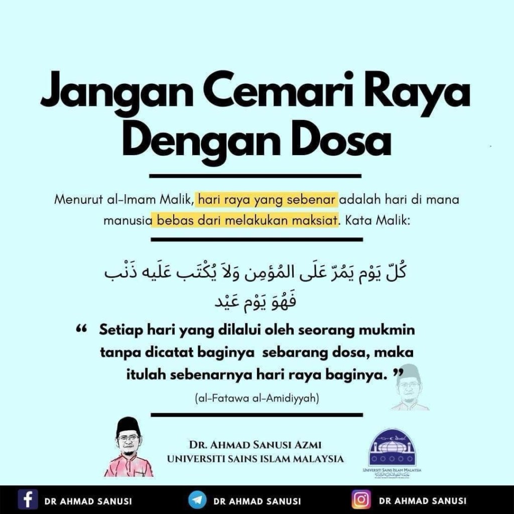 7. Justeru, adalah wajar bagi seorang Muslim menzahirkan kegembiraan mereka pada Hari Raya. Ia adalah perkara yang selaras dengan Sunnah yang dianjurkan oleh Rasulullah. Namun, perayaan kita bukanlah satu perayaan apabila tercemar dengan unsur-unsur maksiat. Benarlah kata Saidina Ali: “Setiap hari yang tidak kita lakukan maksiat adalah hari raya buat kita!”