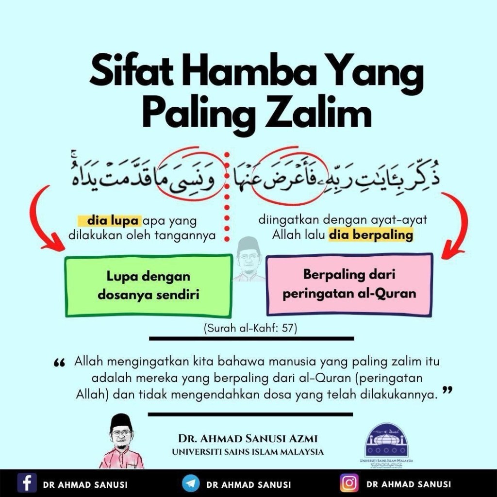 “Dan tidaklah ada yang lebih zalim daripada orang yang diberi ingat dengan ayat-ayat Tuhannya, lalu ia berpaling daripadanya dan lupa akan apa yang telah dilakukan oleh kedua tangannya.”