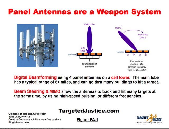 3) Panel antennas on cell towers are part of a “global distributed weapon system.” The antennas use digital beamforming to create microwave “bullets,” that can be very painful, and even lethal.