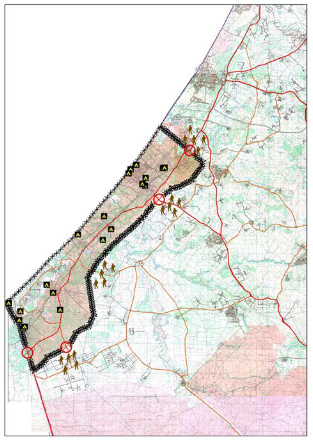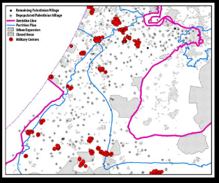 This vast area of land, sparsely populated, with only marginal agricultural output, is not of any particular vital socio-economic importance to the large settled Israeli population elsewhere. The real reason for holding to it is to prevent the return of the land owners to their homes and to have it as a strategic reserve for the future. This reserve is now used to house and maintain Israel’s war machine which is constantly expanding. The attempt to populate the Southern District with new immigrants has achieved limited success in spite of the strenuous efforts of the JNF. [Fig-6] shows the same region with some of the military and strategic locations and closed areas containing military bases, factories, training grounds, missile bases and WMD depots. The density of these sites is unparalleled by any other country. Their disappearance will no doubt serve the cause of peace.