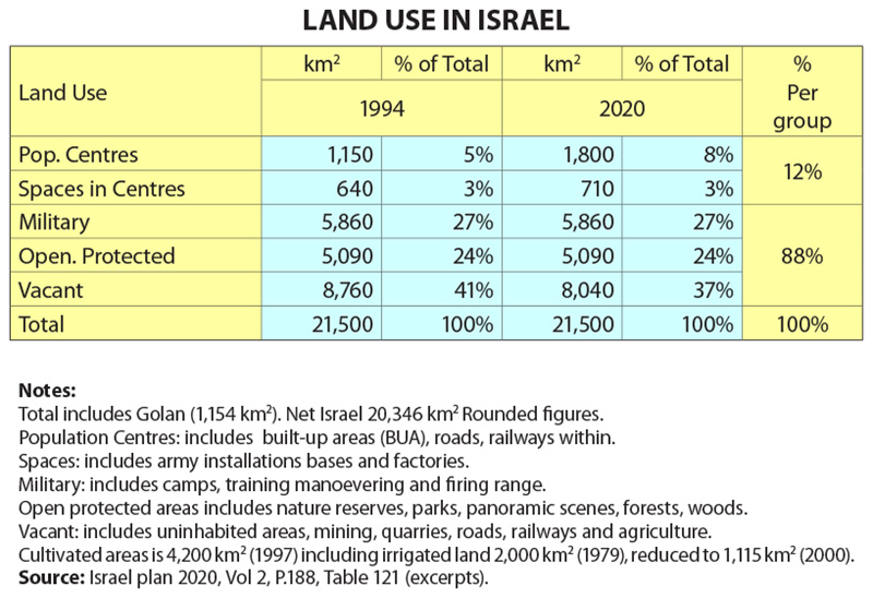 The illustrations in figures 4, 5 and 6 sums up the original cause of the problem, the reason for the continuation of the conflict and the possible ways to end it. This analysis of land use is not a mere conjecture. Israeli records confirm the indicated land use in Israel in 1994 and as projected in 2020 [Fig-7].10 It shows that most of the population lives on 12% of the Israeli land area, while 88% is used as a reserve land for the military, or protected, or closed areas, or vacant land. This includes 4,200 square kilometers of cultivated land, which uses a colossal 70%-80% of the overall water consumption, while producing only 1.5% of Israel’s GDP.11