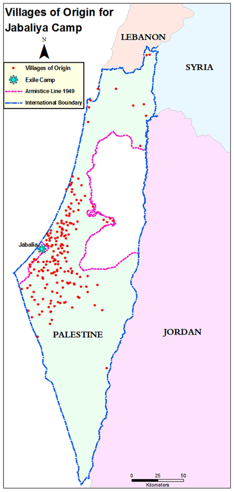 Before al-Nakbah, there were 1304 ‘villages’ in Palestine of which 956 came under Israeli rule13 [Fig-8]. Of these, 773 were Palestinian Arab villages. Israeli ethnic cleansing depopulated the majority, i.e. 674, with only 99 villages evading depopulation. The inhabitants of depopulated villages were exiled into 602 locations, registered and served by UNRWA [Fig-9]. Non-registered refugees live in various Arab and foreign countries. For registered refugees, UNRWA records show who they are, where they are from originally in Palestine and where they were exiled to.14 As an example, take the case of Saffouria, a village in Galilee [Fig-10]. Some inhabitants found refuge in nearby Nazareth. The majority were expelled to Lebanon, Syria, Jordan and the West Bank. Given that they and their descendants are known, it is possible to reconstruct their return from exile camps to their villages of origin. In other words, the process of ethnic cleansing that took place can be reversed with high reliability. Another case is that of Jabalyia Camp in Gaza which was pulverized by F16s and Israeli tanks in the December 2008 to January 2009 Israeli assault. The original villages of those people who took refuge in Jabalyia Camp, their ‘hamulas’ (extended families), even their individual names, are known, [Fig-11]. But Gaza has a special significance. Two hundred and forty seven villages in the Southern District of Mandate Palestine, i.e. Gaza and Beersheba sub-districts, were depopulated and their inhabitants expelled to the tiny Gaza Strip, [Fig-12]. They are huddled in 8 camps in a strip which is 1% of the area of Palestine, besieged from land, sea and air, and subjected to extreme deprivation. The adjacent Israeli town of Sderot, which is frequently in the news, is built on the land of Najd village whose people are now refugees in Gaza, two kilometers away. Today, 1.5 million people live in this most crowded place on earth. Not only were they expelled in 1948, but they have been attacked constantly in their exile ever since.