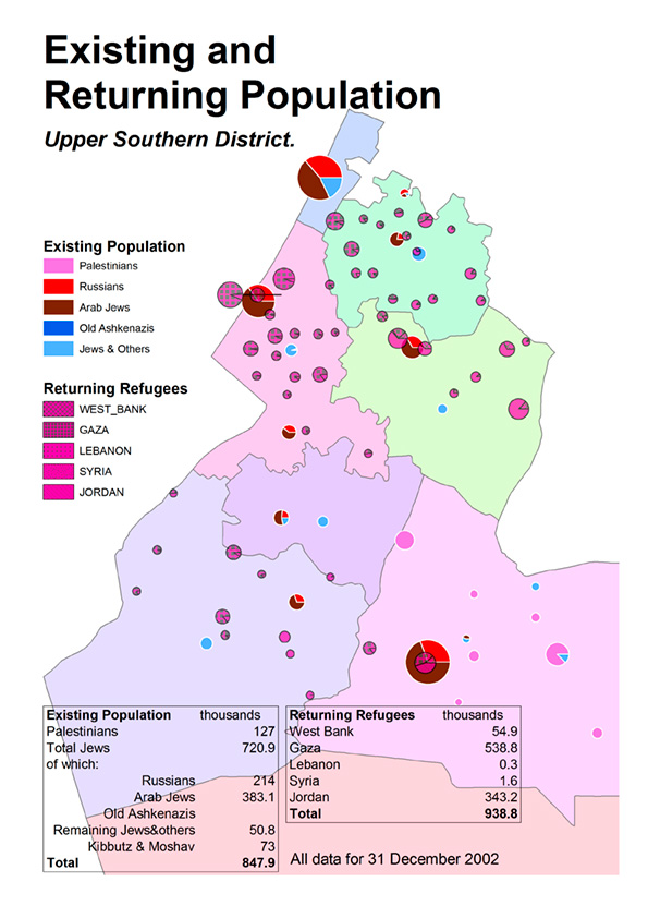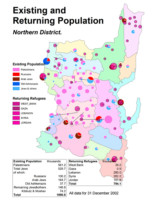 In the present Israeli Northern District, a sizeable percentage of the population is still Palestinian. [Fig-13] shows both the present population and the returning Palestinians. There does not seem to be a problem of over lapping or crowding. Refugees can take a bus and return to live in their homes with their kith and kin. It is a matter of conjecture to forecast how many Jews would wish to remain in a democratic, non-exclusive country. Similarly, it is not certain how many Palestinians would wish to return or remain where they are. In either case, Jews must have the choice and the Palestinians must be able to exercise their inalienable Right of Return.