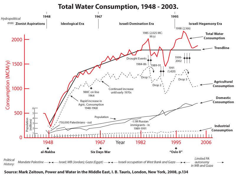 The figure shows how Israel’s consumption rose from 350 million cubic meters per (mcm) at its establishment to about 2000 mcm at present. This increase was provided by the diversion of Arab water. The agricultural consumption of water is erratic and produces a negligible part of GDP. Industrial consumption of water is relatively constant but domestic consumption grows with increased population. ↵